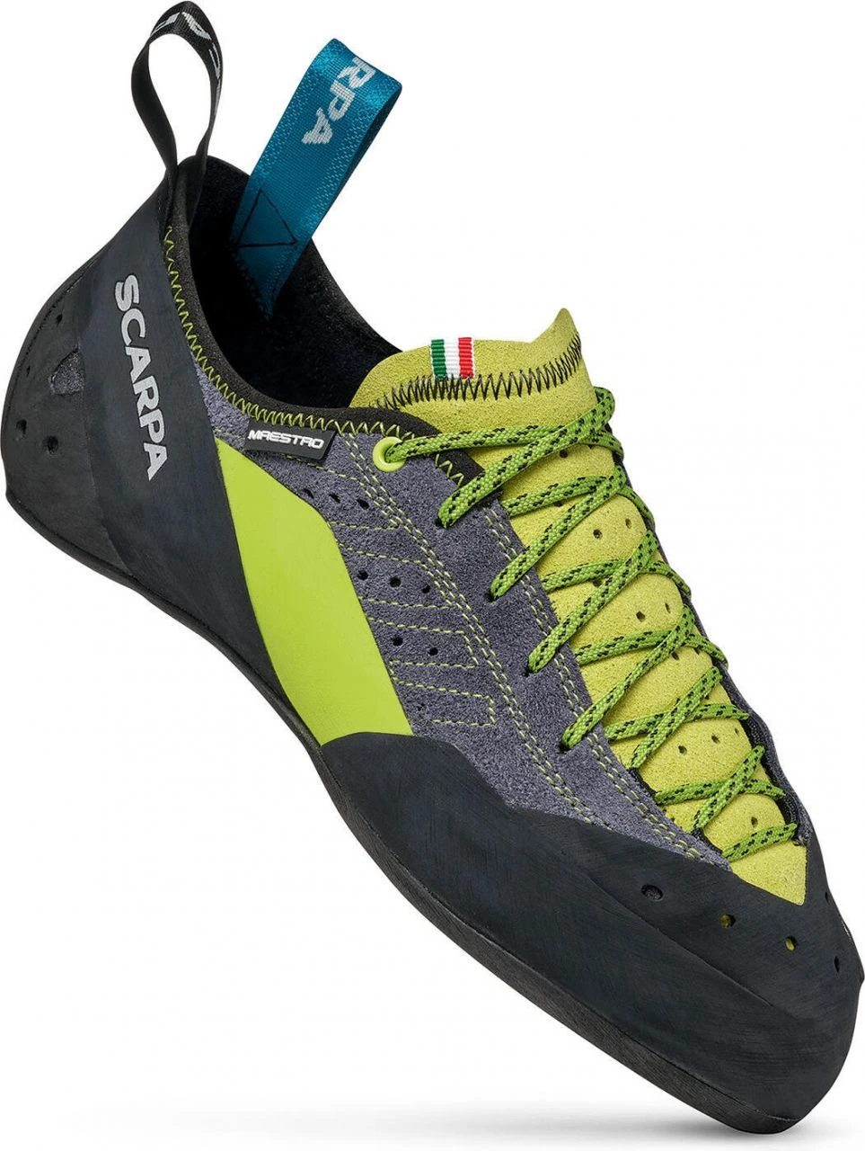The Maestro Eco is the perfect climbing shoe for multi-pitch and sport climbing. The upper is made of microfiber and leather cut parts that are sewn together so that the shape fits perfectly to the foot without causing pressure points. The midfoot receives perfect support from the IPC tension system and from a full-length Flexan insert, but at the same time so much flexibility that standing on friction remains possible. A slight downturn and slightly angled toe box provide good power transfer and a comfortable feel. The full VibramÂŽ XS Edge sole rubber is grippy enough to stand on friction with while providing very good support to the foot muscles over a long period of time.